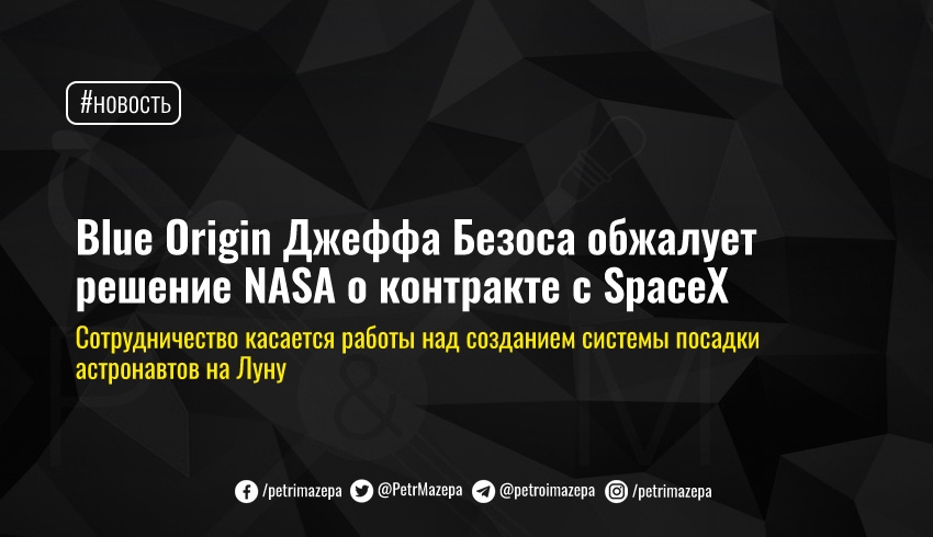 Компания Blue Origin, основателем которой является американский миллиардер Джефф Безос, обжалует решение NASA, выбравшего для сотрудничества в космической программе «Артемида» компанию Илона Маска SpaceX. Общая стоимость контракта NASA, заключенного с компанией Маска, составила 2,89 млрд долларов.