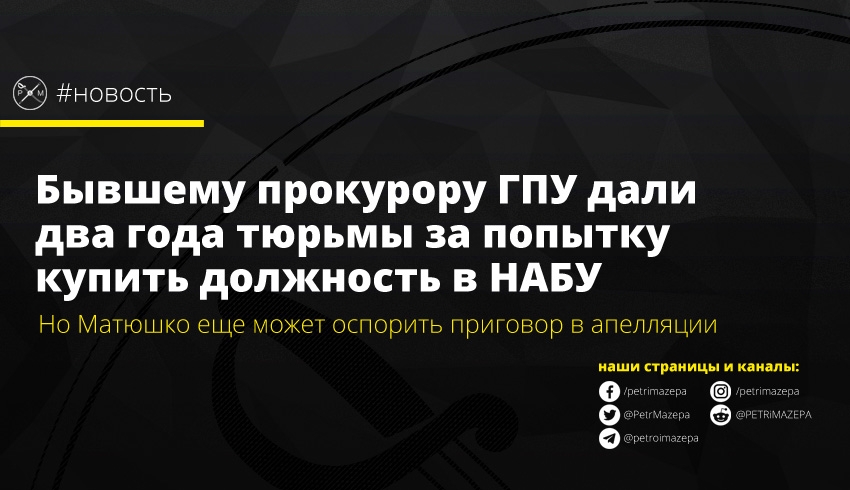Сегодня, 25 сентября, ВАКС объявил обвинительный приговор по делу в отношении бывшего прокурора ГПУ Александра Матюшко за предложение 10 тысяч долларов взятки при попытке попасть в состав НАБУ. Ему дали два года без конфискации, но у Матюшко есть 30 дней на обжалование в апелляции.
