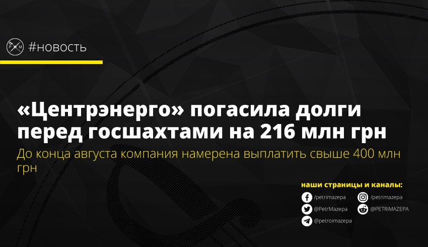 ПАО «Центрэнерго» направило 216 млн грн на погашение задолженности перед госшахтами за поставленное ими ранее топливо.