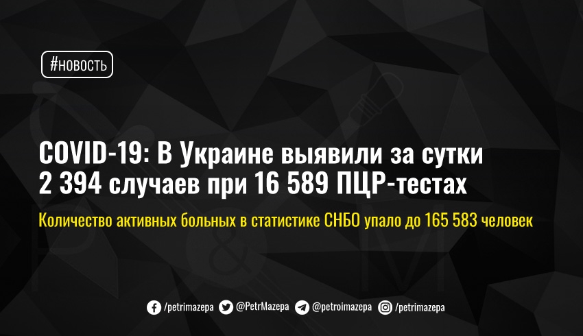 COVID-19: В Украине выявили за сутки 2 394 случаев при 16 589 ПЦР-тестах