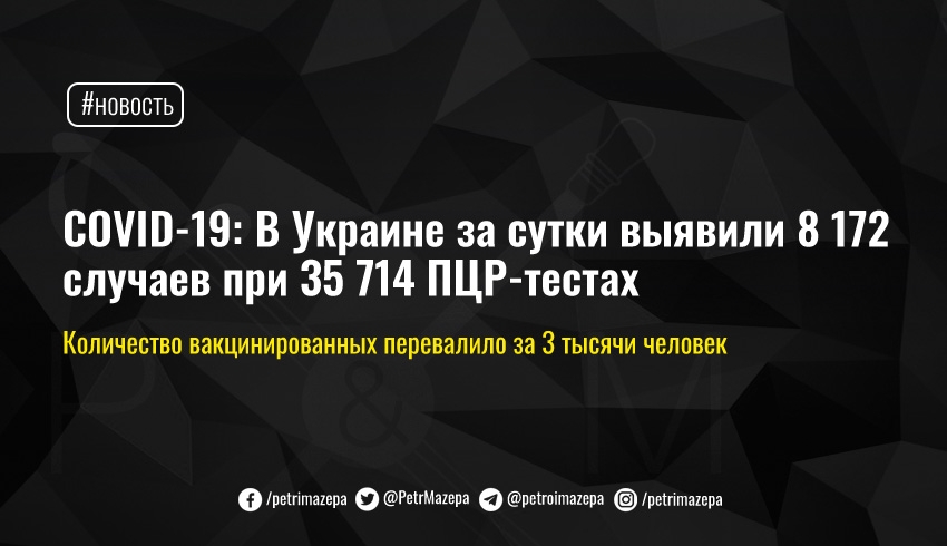 COVID-19: В Украине за сутки выявили 8 172 случаев при 35 714 ПЦР-тестах