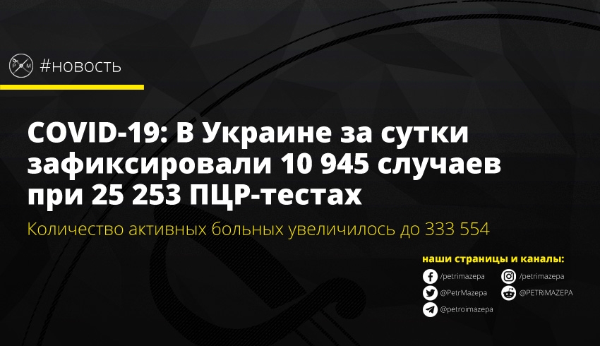 COVID-19: В Украине за сутки зафиксировали 10 945 случаев при 25 253 ПЦР-тестах