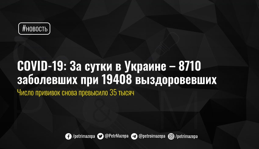 В Украине за вчерашний день было зафиксировано 8 710 новых случаев COVID-19, при 19 408 выздоровевших. Сокращается как число активных больных, так и количество занятых коек, а число вакцинаций за сутки приблизилось к количеству ПЦР-тестов.