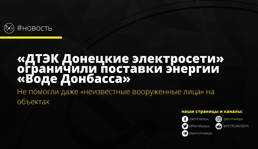 «Электроснабжение было ограничено по причине того, что у КП "Вода Донбасса" окончился 90-дневный договор с ГП "Укринтерэнерго", а договор с новым поставщиком не был заключен», - объясняет свои действия «ДТЭК Донецкие электросети», пишут «Новости Донбасса».