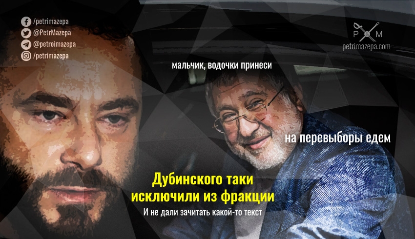 Свежеисключенный парламентарий уже опубликовал текст, который ему якобы не позволили озвучить на собрании фракции. Там он пожаловался на перейденные красные линии. А результат голосования, согласно позиции Дубинского, «ничего общего с интересами Коломойского украинского народа не имеют».