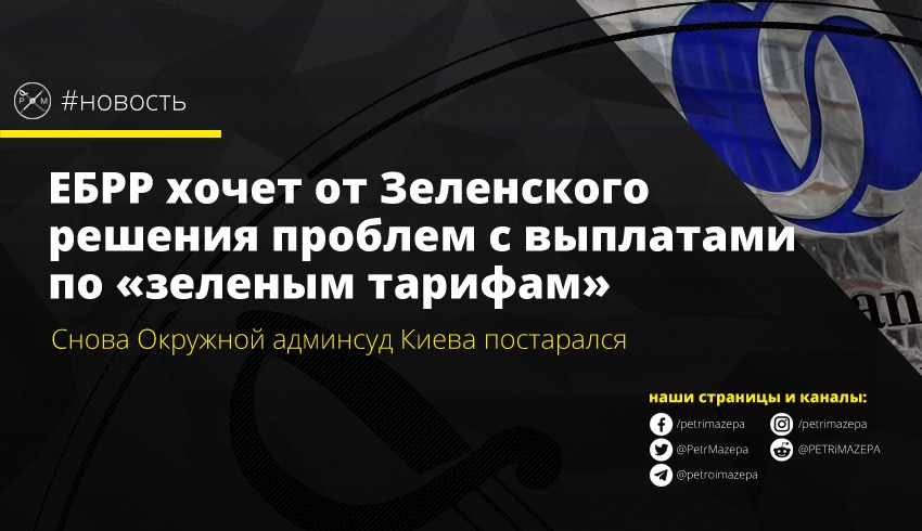 В Европейском банке реконструкции и развития (ЕБРР) озаботились решением Окружного админсуда Киева (ОАСК), которое ставит нового гарантированного покупателя электроэнергии в ситуацию, когда за «зеленый тариф» нечем платить. Поэтому в европейском банке просят президента Украины Владимира Зеленского решить данную проблему.