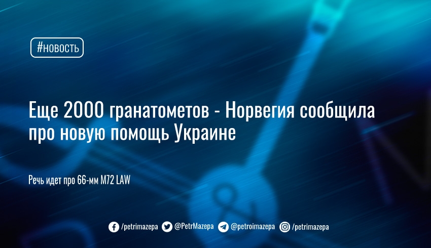 Министерство обороны Норвегии сообщило, что вместо 2 тысяч гранатометов, как планировалось изначально, в Украину поставлено 4 тысячи гранатометов M72 LAW (Light Anti-Tank Weapon).