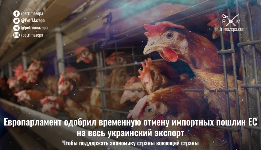 В четверг Европейский парламент поддержал отмену на один год импортных пошлин ЕС на весь украинский экспорт, чтобы поддержать экономику страны. За решение отдали свои голоса 515 евродепутатов, против были 32 и еще 11 воздержались.