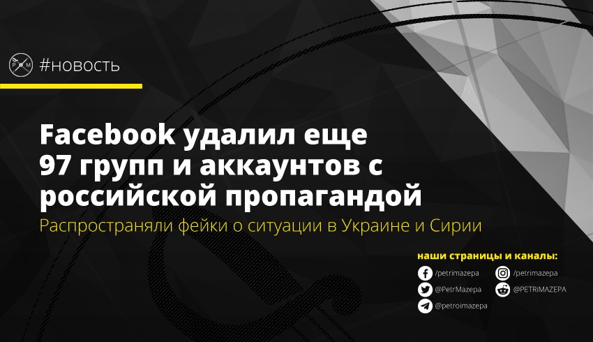 Администрация Facebook удалила 97 аккаунтов, страниц и групп, управляемых РФ. Они распространяли фейки по украинской тематике, политике страны-агрессора, войне в Сирии.