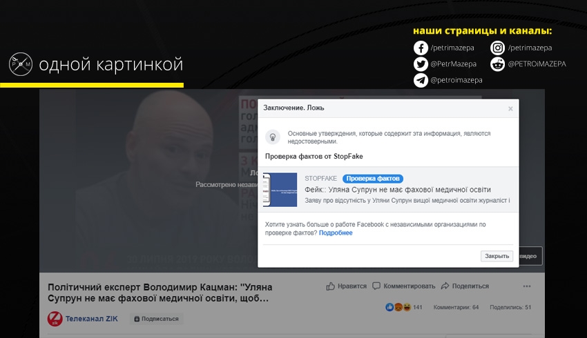 Facebook начал помечать некоторые посты в украинском сегменте как фейковые. Первым среди телеканалов такого удостоился ZIK – содержащим ложную информацию был назван пост про то, что у Уляны Супрун нет медицинского образования. Данное заявление еще в 2019 году сделал на телеканале член политсовета партии «ОПЗЖ» Владимир Кацман.