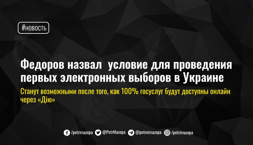 Вице-премьер-министр - министр цифровой трансформации Михаил Федоров сообщил, что электронные выборы станут возможными в Украине после того, как 100% государственных услуг будут доступны онлайн через приложение «Дія». Пока преждевременно говорить о возможности проголосовать в электронном формате