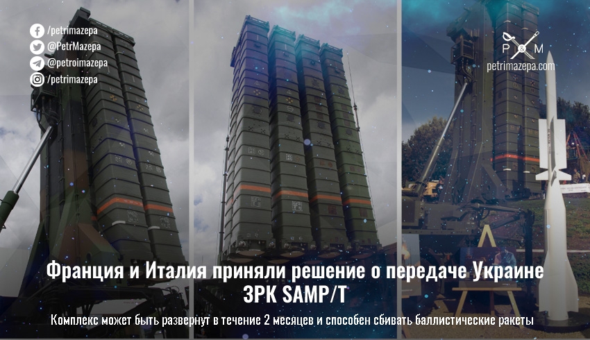 Франция и Италия приняли решение об отправке в Украину зенитного ракетного комплекса (ЗРК) SAMP/T. Ранее итальянская сторона прогнозировала, что этот комплекс может быть развернут в Украине в течение 2 месяцев. Среди прочего комплекс также способен бороться с баллистическими ракетами.