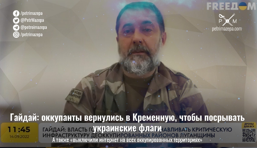 «Перепуганные оккупанты прибежали в Кременную, срывали все украинские флаги, показательно создают видимость своего массового присутствия в городе. Но это временно. Люди вдохновились украинским наступлением и деятельностью партизан», — сообщил Гайдай в эфире канала FREEDOM.