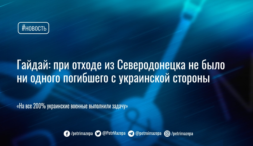Глава Луганской областной военной администрации Сергей Гайдай сообщил, что при отходе из Северодонецка с украинской стороны не было ни одного погибшего.