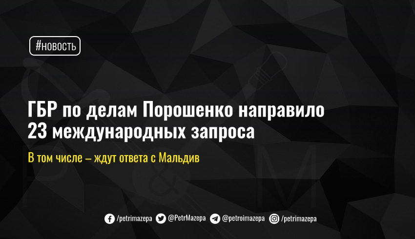 «В ряде уголовных производств, которые расследуются Государственным бюро расследований, Петр Алексеевич (Порошенко - ред.) неоднократно допрашивался. В настоящее время мы ожидаем ответа по результатам 23 запросов об оказании международной правовой помощи от наших иностранных партнеров, в частности Чешской Республики, Франции, Турции, Мальдивской Республики и многих других стран», - сказал исполняющий обязанности директора ГБР Алексей Сухачев рассказал в интервью «Укринформу».