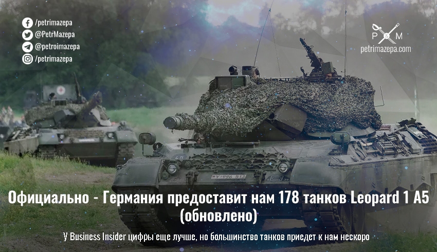 Министр обороны Алексей Резников, который сегодня встретился с немецким коллегой Борисом Писториусом, уточнил: «Правительство Германии уже приняло решение о поставке Украине также танков Leopard 1. Этих танков к лету будет 20-25, к концу года — около 80, и в течение 2024 года — более 100 танков Leopard 1. Это минимум три батальона, включая материалы, которые нужно будет докупить, запасные части, амуницию и, конечно, обучение».