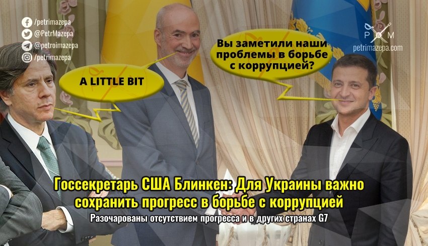А вечером о необходимости продолжать антикоррупционные реформы главе МИД Украины Дмитрию Кулебе напомнили в Госдепартаменте США. В сообщении, которое Госдеп опубликовал по результатам разговора его главы Энтони Блинкена и главы МИД Украины, говорится: «Госсекретарь Блинкен подчеркнул важность для Украины сохранения прогресса в борьбе с коррупцией и обеспечении верховенства права и экономических реформ».