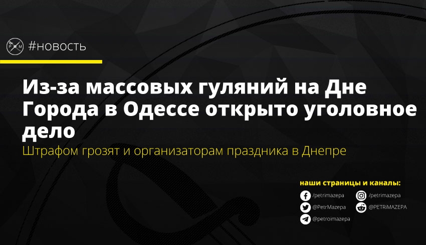 Во время празднования Дня города в Одессе и Днепре не соблюдались карантинные нормы, из-за чего организаторам праздника грозит штраф в размере 170 тыс. грн. Также в Одессе открыто по данному факту открыто уголовное производство, еще одно обещают открыть если эпидемиологическое расследование установит причинно-следственную связь между этими празднованиями и увеличением количества заболевших COVID-19.