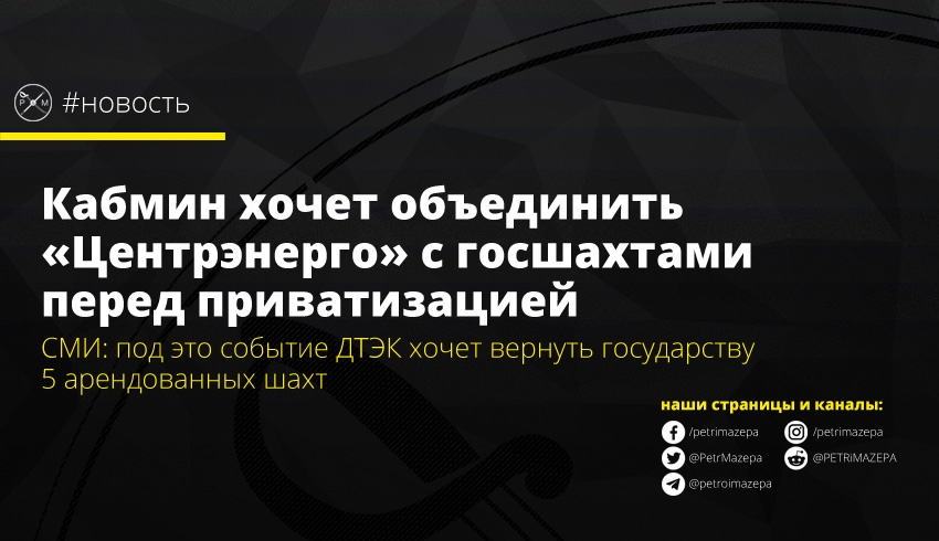 Сегодня на заседании Кабинета министров будет рассмотрено создание межведомственной рабочей группы, которая займется вопросом определения модели объединения государственных угледобывающих предприятий и ПАО «Центрэнерго». Накануне появился комментарий «ДТЭК Добропольеуголь» про более плодотворное сотрудничество с ПАО «Центрэнерго». А СМИ написали, что арендованные шахты Добропольеуголь в ДТЭК предлагают вернуть обратно государству.