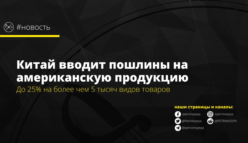 Министерство финансов Китая объявило о ведении ответных пошлин в размере 5-25% на более чем 5 тысяч видов продукции из США. Свое решение Пекин объяснил необходимостью принятия ответных мер на односторонние действия Штатов, которые ввели дополнительные пошлины на китайские товары.
