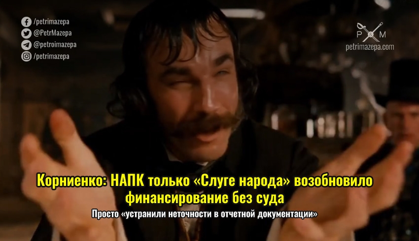 Глава партии «Слуга народа» Александр Корниенко похвастался, что НАПК только для них возобновило государственное финансирование без судебных процессов. Оказалось, что «после проверки уточняющих отчетов» претензии исчезли.