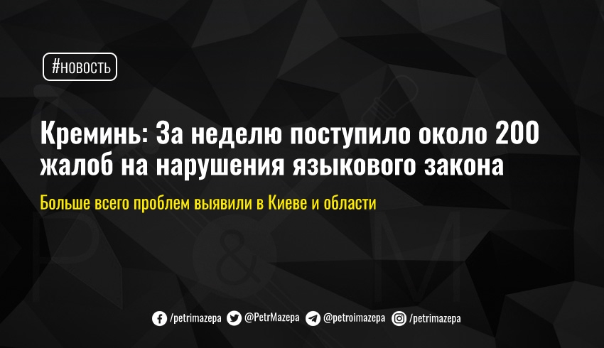 Уполномоченный по защите государственного языка Тарас Кремень в Facebook сообщил, что большинство обращений касаются отсутствия украинской версии сайтов интернет-изданий и интернет-магазинов – 117. В то же время о нарушении прав в сфере обслуживания сообщили 34 гражданина. На рекламу на негосударственном языке пожаловались 25 человек, нарушения языкового законодательства в области образования – 4, использования должностными лицами органов государственной власти и органов местного самоуправления государственного языка при исполнении своих обязанностей – 3.