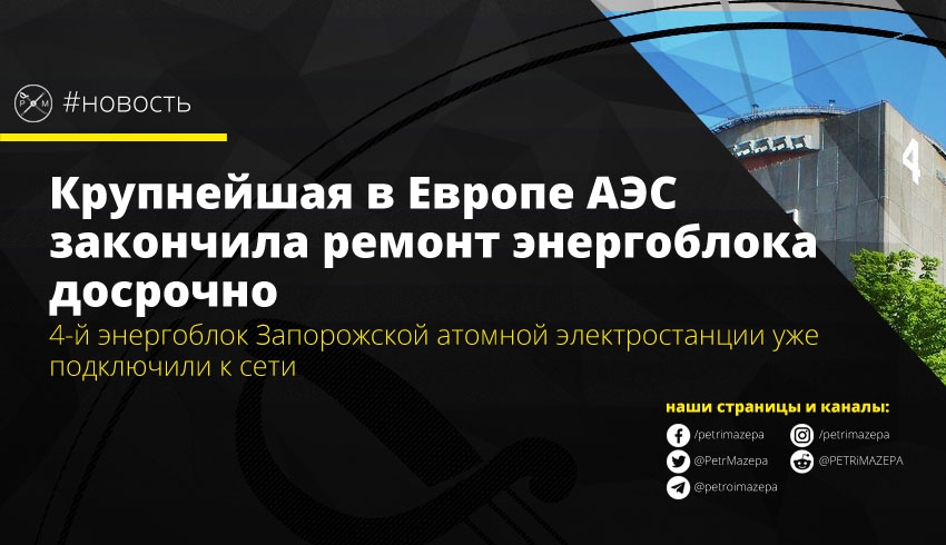 Запорожская АЭС досрочно закончила ремонт и подключила к сети энергоблок №4. На данный момент в работе на самой крупной атомной электростанции 5 энергоблоков из 6, на еще одном продолжается плановый ремонт.