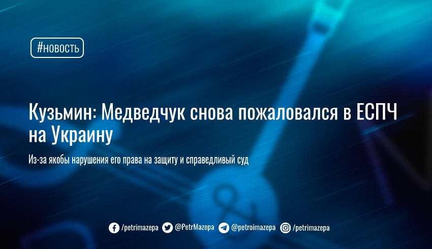 Нардеп от «ОПЗЖ» Ренат Кузьмин в Facebook сообщил, что Медведчук подал второй иск к Украине в ЕСПЧ. По словам Кузьмина, «в этот раз речь идет о грубом нарушении права на защиту, права на справедливый суд и личную свободу».