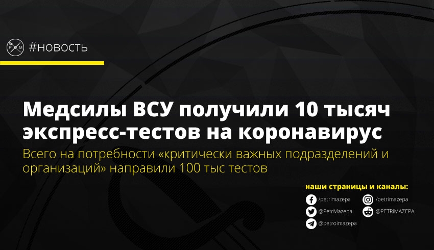 Медицинские силы ВСУ получили 10 тысяч экспресс-тестов, 20 тысяч защитных масок, а также 80 специальных защитных костюмов, изготовленных одним из отечественных предприятий для нужд ВСУ.