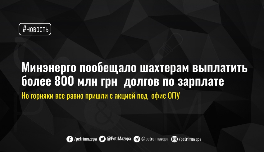 Несмотря на сообщение Минэнерго о выплате задолженности в ближайшие дни, в среду, 12 мая, возле здания Офиса президента Украины в Киеве проходит акция протеста шахтеров, сообщил глава Независимого профсоюза горняков Украины (НПГУ) Михаил Волынец. «Среди требований протестующих: рассчитаться с горняками шахт по зарплатным долгам, остановить разрушительные процессы в угольной отрасли, установить адекватную цену на уголь, остановить губительный для отечественного энергорынка импорт ресурсов из России и Беларуси, отозвать законопроекты, которыми ликвидируется социальный диалог и устанавливается диктатура работодателя», - написал Волынец в соцсети Facebook.