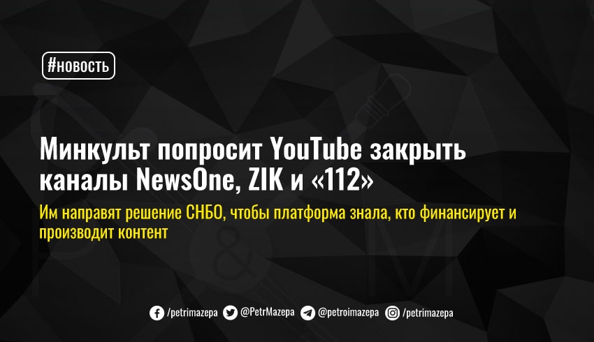 Минкульт попросит YouTube закрыть каналы NewsOne, ZIK и «112»