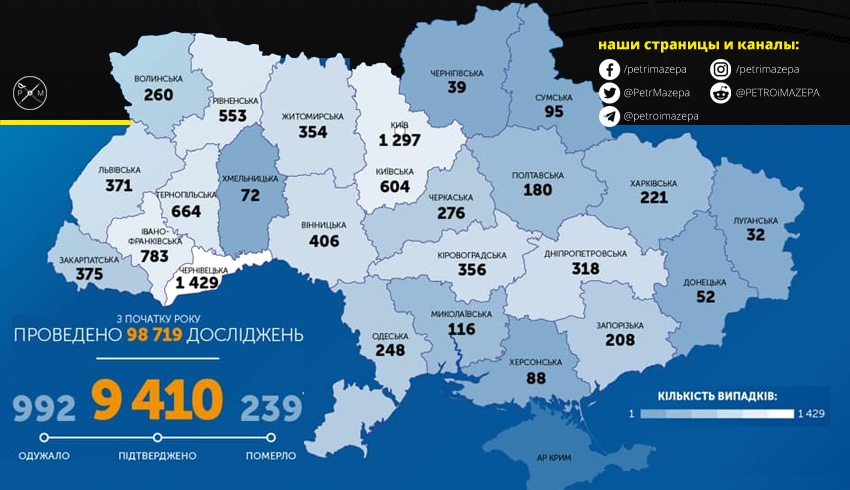 За сутки в Украине было зафиксировано 401 случаев заболевания COVID-19, всего число заболевших достигло 9410, из них 2980 были госпитализированы 121 человек на аппарате ИВЛ, в том числе 1 ребенок и 7 медиков. На амбулаторном лечении находятся 6430 пациентов. Всего за вчерашний день было зафиксировано 19 летальных случаев, общее число летальных случаев достигло 239, выздоровело всего 992 пациента.