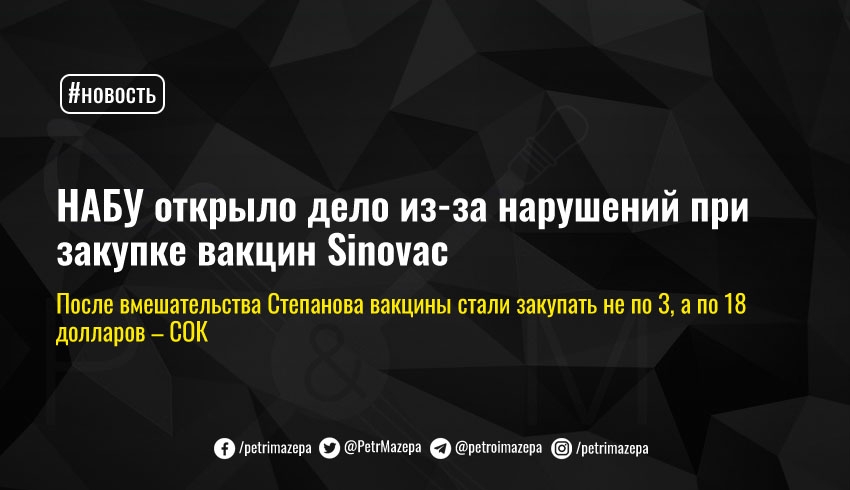 По данным Совета, ГП «Медичні закупівлі» начало переговоры касательно закупки вакцины с ориентировочной стоимостью в 3 доллара за 1 дозу, и переговоры находились уже на финальном этапе. «Однако позже министр Максим Степанов в ручном режиме остановил этот процесс и поручил начать переговоры касательно закупок китайской вакцины у компании Sinovac Biotech», - информирует СОК НАБУ.