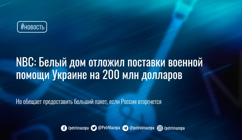 В администрации президента США Джо Байдена отложили поставки в Украину дополнительной военной помощи на 200 миллионов долларов, сообщает NBC.