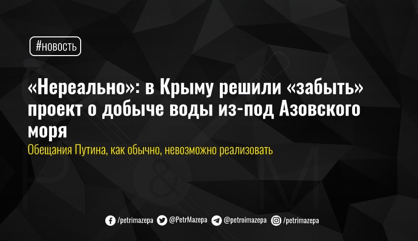 Идею о добыче воды из-под Азовского моря высказал глава страны-агрессора Путин, на своей большой пиар-акции, которую почему-то называют пресс-конференцией. Тогда он заявлял, что пресной воды в Крыму достаточно. С того момента не прошло и полугода.