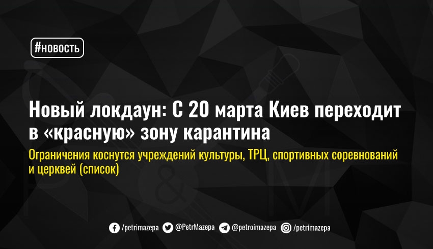 В Киеве с 00:00 часов 20 марта, то есть в ночь с пятницы на субботу, внедряется «красная» зона карантина из-за угрожающей ситуации с распространением коронавируса. Будут запрещены массовые мероприятия, работа учреждений культуры, ТРЦ, введены ограничения на проведение богослужений, а кафе и рестораны смогут работать только на вынос.