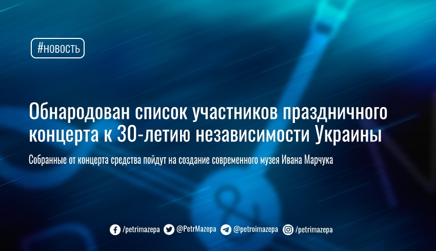 Стал известен состав участников праздничного концерта к 30-летию независимости Украины, который состоится 24 августа на НСК «Олимпийский». Собранные от концерта средства пойдут на создание современного музея Ивана Марчука.