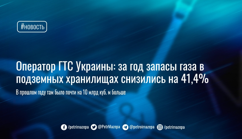 Оператор ГТС Украины: за год запасы газа в подземных хранилищах снизились на 41,4%
