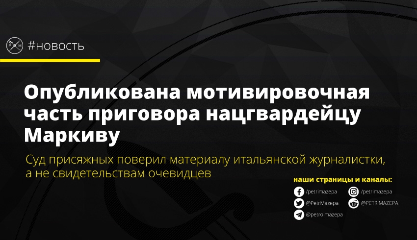 В итальянской Павии суд присяжных опубликовал мотивировочную часть приговора нацгвардейцу Виталию Маркиву. Итальянцы поверили материалу своей журналистки, а не официальным бумагам из Украины и показаниям, данным под присягой, в зале суда. Поверили настолько, что осудили человека на 24 года заключения.