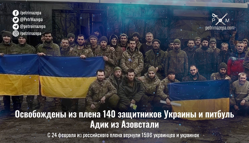 31 декабря состоялся очередной обмен пленными. Из российского плена были освобождены 140 защитников и защитниц Украины. Среди них — раненые, защитники Мариуполя, острова Змеиный, добровольцы ТРО из Славутича, а также наши с Бахмутского направления. Также домой вернулся питбуль Адик с Азовстали.