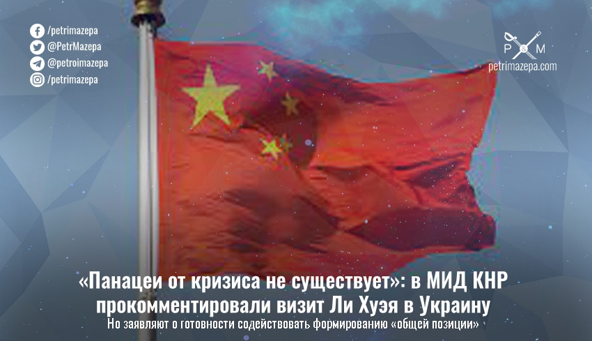 МИД КНР после визита в Киев спецпредставителя Китая по делам Евразии Ли Хуэя заявило, что не существует уникального средства для урегулирования ситуации вокруг Украины. Пекин готов к самостоятельным шагам для скорейшего урегулирования ситуации и восстановления мира, а также содействовать мировому сообществу в формировании общей позиции по урегулированию ситуации вокруг Украины.