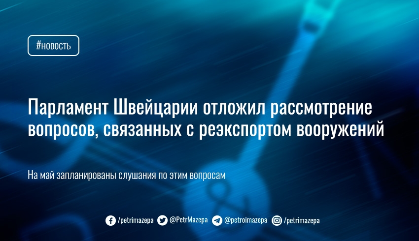 Комитет по политике безопасности Совета кантонов Швейцарии (верхней палаты парламента, Федерального собрания) приостановил рассмотрение всех без исключения вопросов, связанных с реэкспортом вооружений.