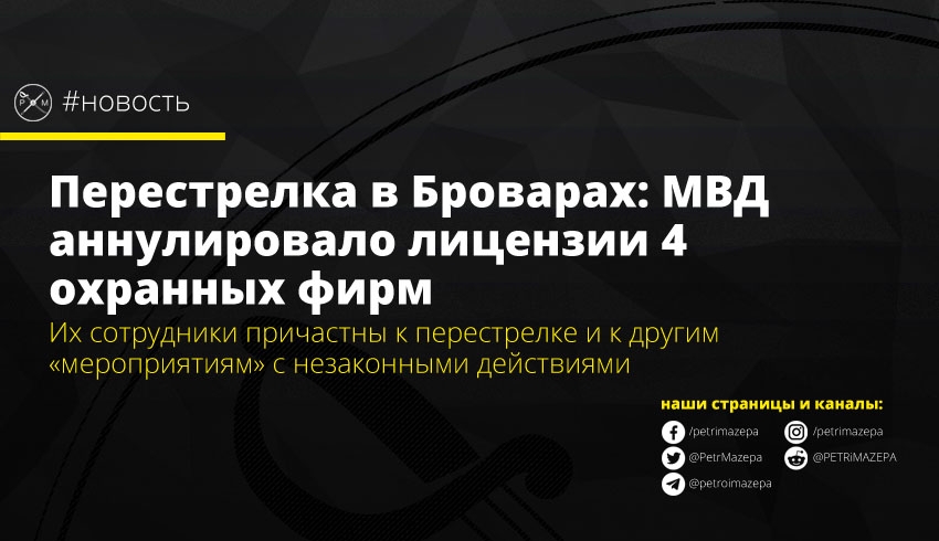 «Следователи Национальной полиции Украины, в рамках расследования уголовных дел касательно стрельбы в Броварах, обратились к Министерству внутренних дел для проведения проверки деятельности четырех столичных охранных фирм, работники которых по информации досудебного расследования, являются участниками перестрелки в Киевской области. Указами Министерства от 05.06.2020 полностью аннулированы лицензии на проведение охранной деятельности: ООО “Профохорона ”, ООО “ Охоронна група “Київ-центр ”, ООО “ ДВ-Сек’юріті”, ООО “ Охоронна група «Форт-3”», - цитирует пресс-служба Министерства замминистра Сергея Гончарова.