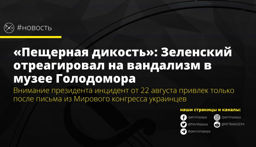 Президент Владимир Зеленский отреагировал на вандализм в Национальном музее Голодомора-геноцида. Инцидент произошел еще ночью с 21 на 22 августа, но президент только сегодня, после получения письма от главы Мирового конгресса украинцев заявил, что «неприятно удивлен» им, и потребовал отчета о расследовании уже в течение месяца.