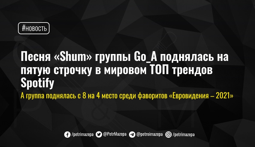 Песня «Shum» группы Go_A, с которой они представляют Украину на Евровидении, попала в глобальный рейтинг ТОП 50 трендов Spotify. Песня занимает пятую строчку.