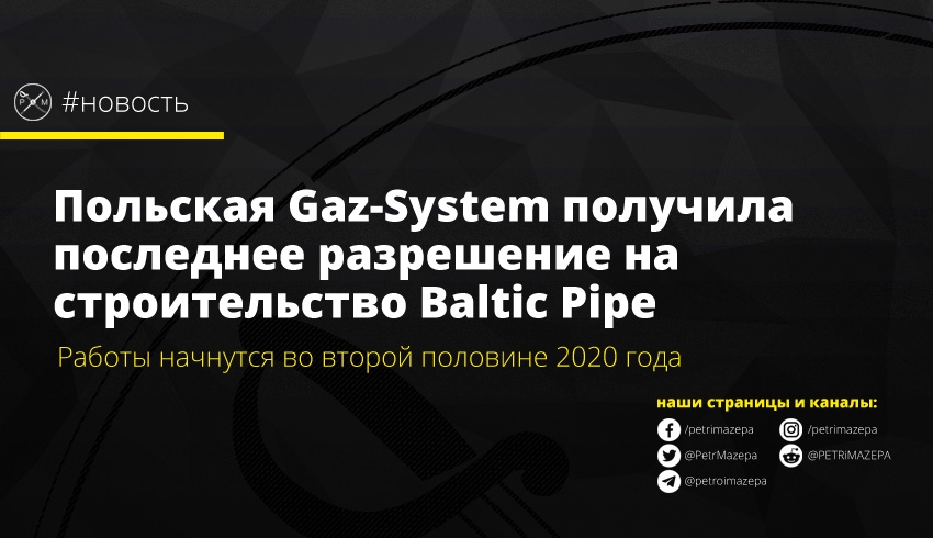 Польская компания Gaz-System получила на прошлой неделе последнее разрешение, необходимое для строительства газопровода Baltic Pipe, который свяжет месторождения норвежского шельфа с Польшей.
