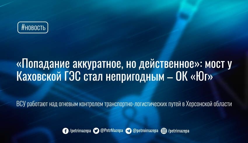 Оперативное командование «Юг» сообщило, что благодаря точному попаданию мост в районе Каховской ГЭС непригоден для использования.