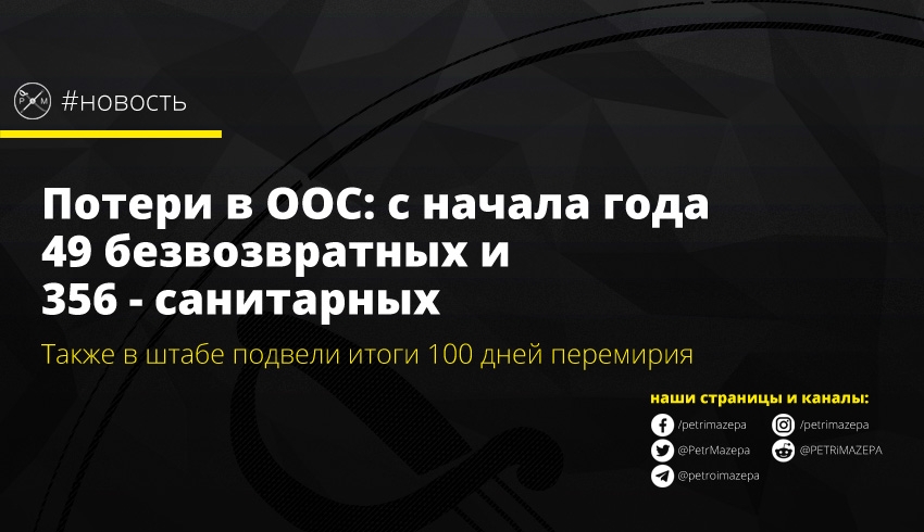 Всего с начала года, по состоянию на 1 ноября года зафиксировано 2360 обстрелов позиций наших войск, из них 814 - обстрелы с применением вооружения, запрещенного минского договоренностями. Боевые потери составили 405 военнослужащих: безвозвратные - 49, санитарные - 356.