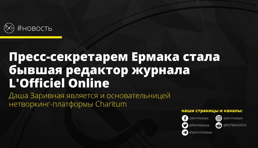 Пресс-секретарем новоизбранного главы Офиса президента Андрея Ермака стала бывшая шеф-редактор издания L'Officiel Online, основательница нетворкинг-платформы Charitum и интернет-журнала Vector Даша Заривная.