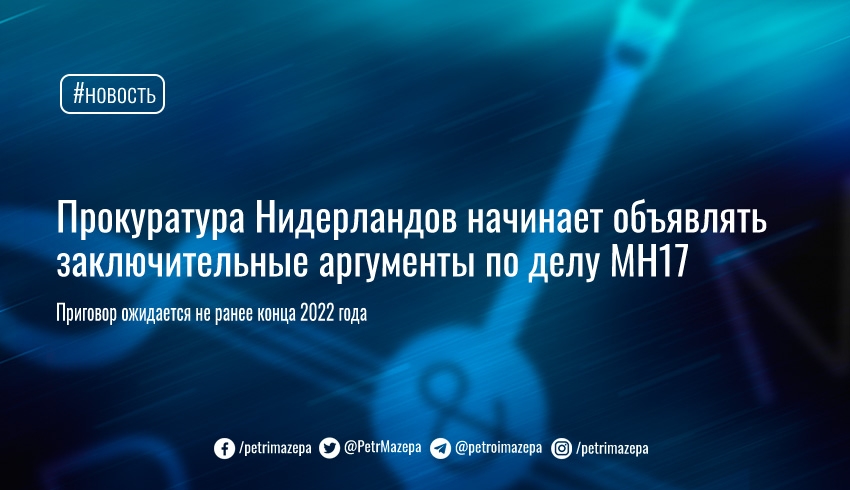 Сегодня голландская прокуратура начала предъявлять обвинение трем россиянам и одному украинцу, которых судят заочно, в том, что они в 2014 году сбили самолет MH17 Malaysia Airlines и убили 298 человек на борту. Приговор в суде ожидается не ранее конца следующего года.
